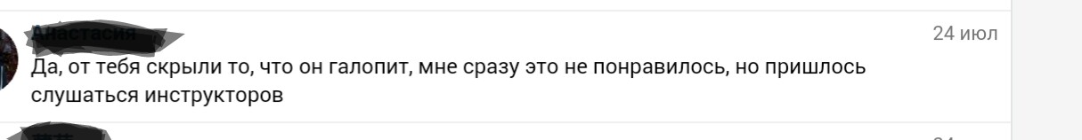Придя домой, я случайно нахожу их группу, листаю, смотрю участников, и нахожу фотографии год назад (август 2016) где он галопирует под верхом. Интересная ситуация. Я звоню горе-диреткору конюшни, и спрашиваю, когда начали заезжать этого коня, на что мне следует ответ "ой, не помню, ну в конце осени". А когда я в лоб говорю о фотографиях, мне начинают говорить, что это другой конь, а потом и вовсе, что я наверное не отличила шаг от галопа, и быть такого вообще не может. В общем я народа информации на эту конюшню, и на коня в частности. Коня, судя по всему, форсировали, что привело к отбиванию на шенкель (только на галопе), после чего его отдали под опеку Чудо-тренера, который безбожно его бил. И конь вообще слетел с катушек. Сейчас же этот конь начал свечить, и кидаться на людей. (благо, я его не купила)
