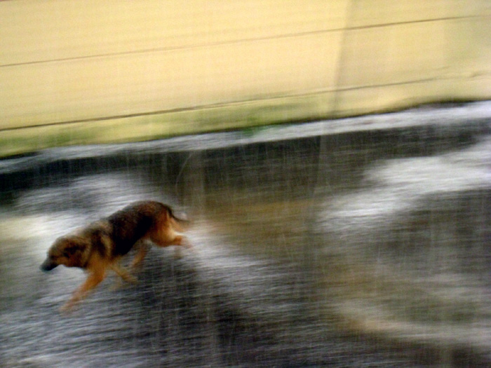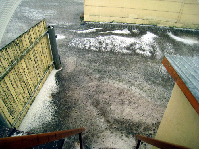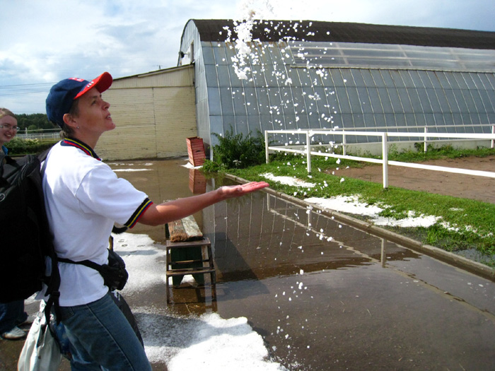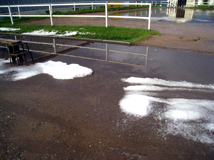 Итак, мы поработали, замыли Заю, почистили, попасли, девчонки нарвали ей мешок травы. Сделали потягушки. А в это время, погромыхивая всё громче и громче, на базу медленно надвигалась тёмно-фиолетовая туча. Покормив Заю обедом, мы шли в комнату, когда упали первые капли. Мы успели заскочить под крышу, и тут хлынул дождь! Из окна комнаты наблюдая этот потоп с молниями и громом, мы радовались, что успели всё сделать, но не успели выехать с базы! Эта радость усилилась вдвойне, когда к ливню добавился ГРАД!!! Ох как грохотало!!! Столпившись у открытого окна, мы с ахами и охами взирали на это великолепие разбушевавшейся стихии! По асфальту мчались бурные реки, обтекая настоящие ледяные острова из града. Пейзаж начал весьма сильно смахивать на зимний – слишком много белого и холодного вокруг! Зима среди лета впечатляла! И, конечно же, я не смогла удержаться от того, чтобы не поснимать всю эту экзотику!