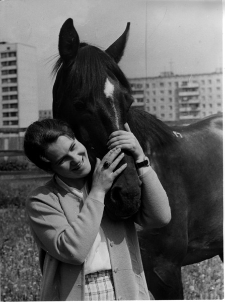 А это на тренировке в академии. Тренер Лобачёв В. А. Обратите внимание на поведение коня – полное спокойствие и доверие. Причём кадр не постановочный, Мария Валентиновна рассказывала, что подобные упражнения были обязательной частью тренировок и здесь её просто сфотографировала подруга на одном из обычных занятий.