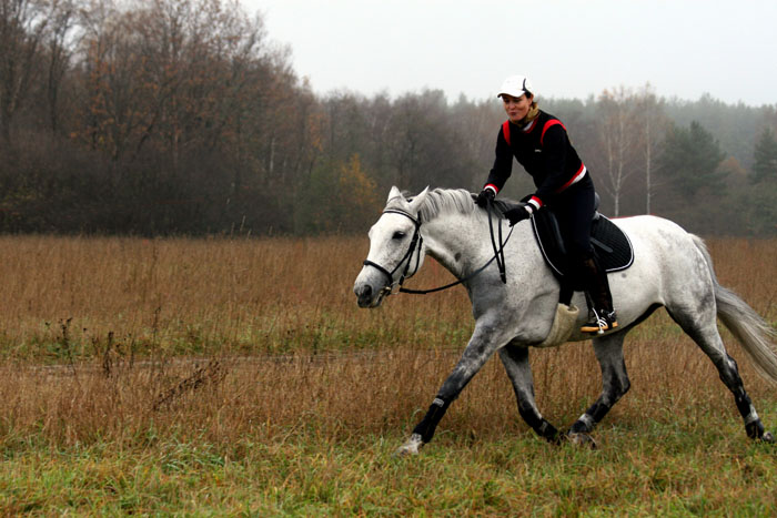 Соня, мы Зае тянули передние ноги для большей амплитуды работы плеча. Учили её саму поднимать ноги как можно выше, сначала на месте, потом на шагу. Это начальный этап обучения испанскому шагу. У меня тут фотки были где-то в недрах дневника (по-моему, в районе август-сентябрь), там видно, как Зая старается поднимая ноги! Конечно, просто обычным моционом хорошие просторные движения не нарабатываются, тут и кавалетти нужны и такие вот размашки на рыси по прямой. Т