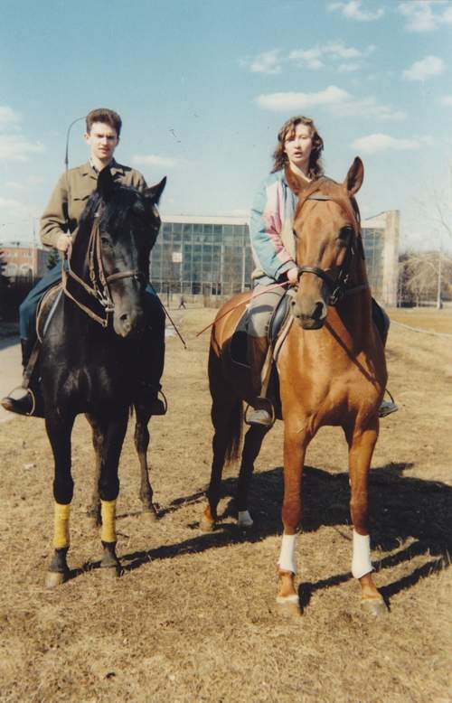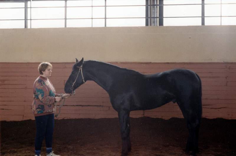 Вот тут мы с ним во время занятий. Студенты самых разных факультетов, не только коневодческого, приходили в манеж со своими преподавателями, а мы им устраивали выводки на разные темы. Буса мы обычно показывали на выводке по породам. Со стороны все выглядит вполне пристойно, но на самом деле он только и ждет удобного момента, как бы меня цапнуть, причем убрать руку подальше и держать, допустим, за конец повода было невозможно, он тут же начинал вертеться, как вошь на гребешке. Ну, а я, соответственно, бурчу так, чтобы слышал только он, мол, только попробуй, ка-ак дам болллльно... (и дальше матом, как обычно)