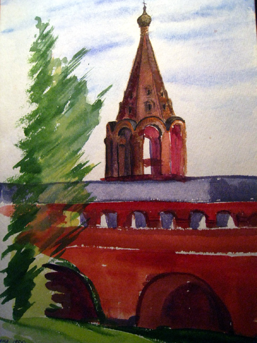 Освоив навыки рисования пейзажей, мы приступили к следующему этапу – изображение архитектуры... У-у-у..., подумала я, это так сложно и скучно... Но каково же было моё удивление, когда оказалось, что вовсе и нет!!! Рисовали мы в основном монастыри и церкви. Во-первых, это потрясающе красиво, а во-вторых, нам же предстояло всё это потом рисовать на деревянных изделиях. В основном, это всё срисовывалось с фотографий (кто думает, что это легко, пусть попробует сам!), но пару раз нас вывозили "на натуру"! Первый раз мы поехали на Крутицкое подворье. Прям как настоящие художники – краски, кисточки, стульчик, чтоб сидеть в процессе творчества! Так здорово – сидишь, рисуешь, народ вокруг ходит, через плечо тебе заглядывают! Очень приятно было слышать за спиной шепоток "Похоже!". Конечно, наши работы и в подмётки не годились тем, которые рисовали уже опытные художники, тоже пришедшие туда на натуру. Но всё равно было приятно приобщиться к процессу творчества, пусть даже на дилетантском уровне.