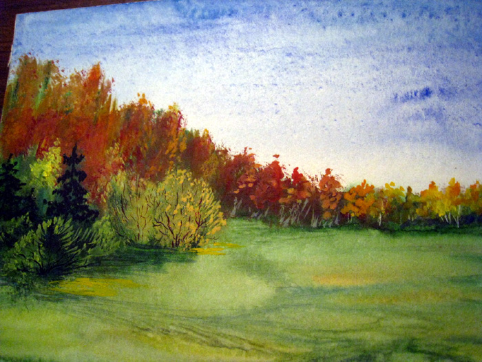 Ну а дальше... Думаете лето? Неет! Лето рисовать не очень интересно, есть гораздо более красочное время года – осень! Какое буйство красок! Какие возможности для художника!!! Ну мы и ринулись в творчество! Конечно, летом тоже не пренебрегали, особенно мне нравились пейзажи, где есть вода. Там можно было сделать очень эффектное отражение прибрежных кустов и деревьев, что придавало водоёму удивительную правдоподобность.