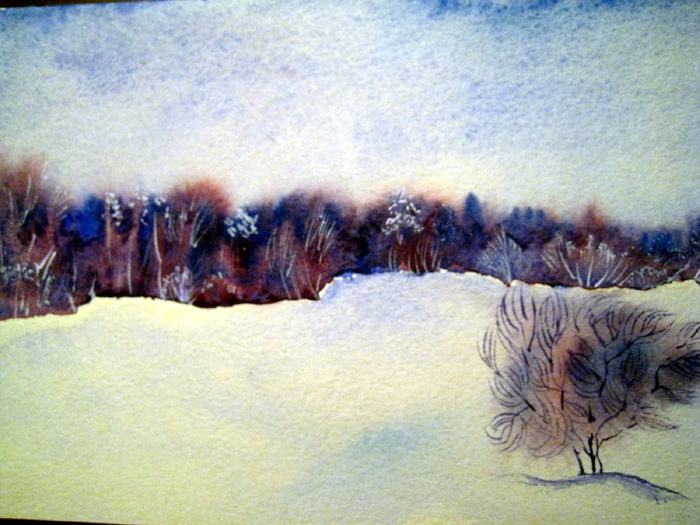 А ещё мне очень понравилось, как мы рисовали полоску далёкого зимнего леса. На пушисто расплывшемся по бумаге акварельном фоне тонкой кисточкой белой гуашью прорисовывались заиндевевшие стволы и засыпанные снегом ветки сосен. Сразу создавалось ощущение мороза! Ну и на переднем плане небольшой кустик, растущий посреди заснеженного поля – голые ветки, показанные тонкими штрихами, и голубоватая тень на снегу... Получалось красиво и таинственно...