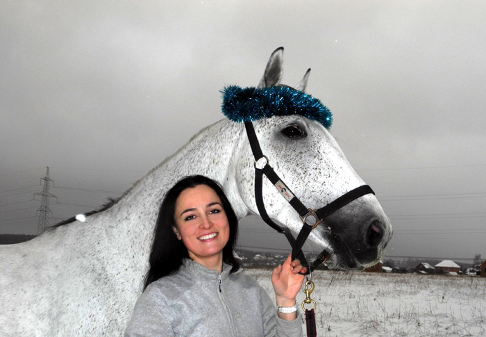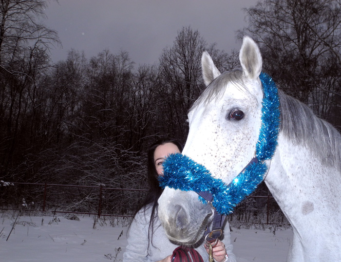 А вот наше главное супер-пупер достижение!!! Помните мои летние попытки сфоткать Заю в венке из одуванчиков? Она тогда стряхивала этот венок с себя с жутким остервенением!!! Поэтому мне очень хотелось посмотреть, как сейчас кобылица отреагирует на мои попытки намотать венок из мишуры. О чудо!!! Заища повела себя абсолютно адекватно!!! Даже попыток не было избавиться от венка!!! Какая умная лошадка!!! :mrgreen: