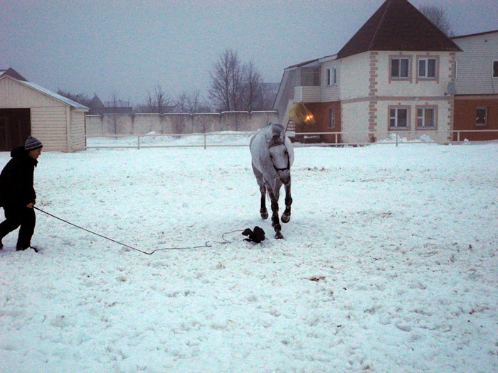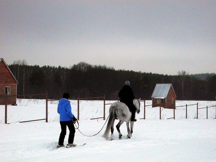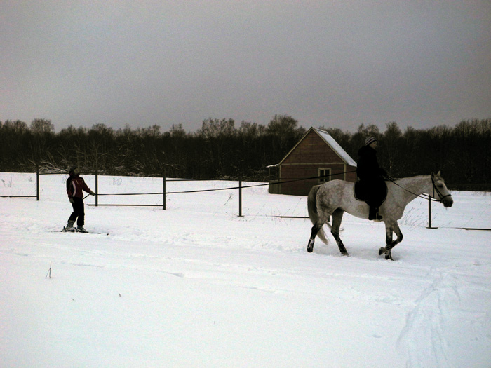 Ань, потому что из всего снаряжения для этого скиджоринга у нас была только я! :lol: Из знакомых на конюшне этим тоже никто не занимается, так что даже посмотреть или попросить что-то такое было не у кого. Но зато я на себе прочувствовала, какую нагрузку испытывает лошадь, когда тащит лыжника.))))