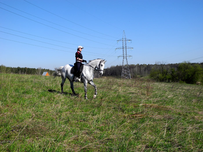 На галопе работали на склоне. Вниз я вела Заищу на сокращённом галопе