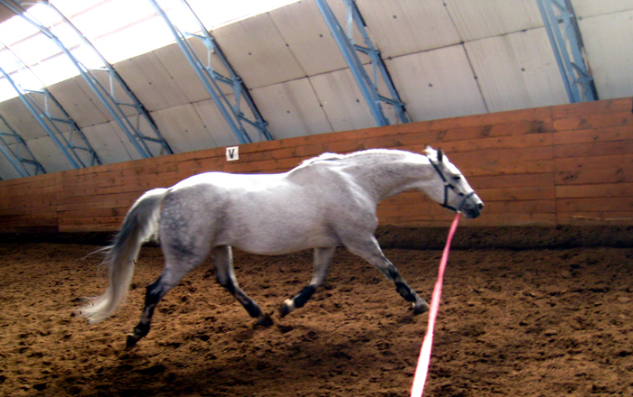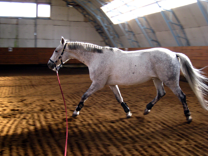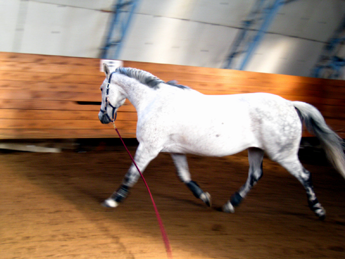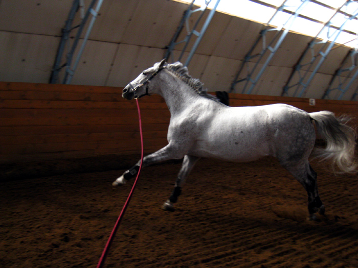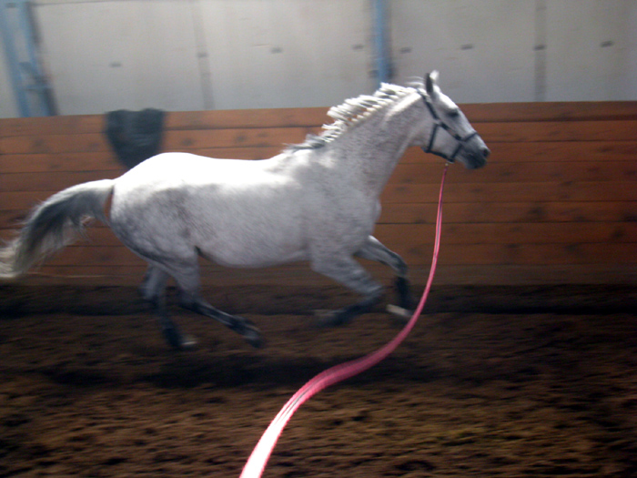 Лен, конечно можно на ты!)))))) Честно говоря я её тогда к дисциплине особо не призывала, потому что это было где-то в середине первой рыси, где ей ещё позволяется играть. Тем более, что дело ограничилось вот этим самым подпрыгиванием. :mrgreen: А шагать на корде первые 10 минут надо учить. Сначала можно даже пошагать с конём в руках по кордовому кругу, показывая ему таким образом, что выходя работать на корде, не нужно сразу же бросаться бежать (сейчас всё чаще и чаще наблюдаю эту тенденцию - человек выводит лошадь на корде, едва отпустил, она тут же стартует и начинает "работать"... И если раньше это делали в основном некоторые недобросовестные коноводы-таджики, которые ради заработка набрали кучу лошадей, а времени на нормальную работу не хватает, то сейчас вижу такое у некоторых "спортсменов". Пишу в кавычках, т.к. не могу воспринимать человека, сознательно делающего такое, как спортсмена-конника). Так что, если у лошади есть такая тенденция, то надо приучать к спокойному шагу. Начинать, конечно, лучше, когда нет раздражающих факторов, чтобы конь мог в спокойной обстановке разобраться, чего, собственно, от него требуется. Ну и, ясное дело, похвала, лакомство!)))) Если рядом шагает спокойно, отпускаем корду на пару метров и идём по меньшему кругу, а конь по большему. Добиваемся спокойного шага в таком положении. "Добиваемся спокойного шага" имеется в виду не "прошли полкружочка, о, нормально шагает", а то, что конь продолжает шагать даже если привели другую лошадь (1 этап), другая лошадь начала работать (2 этап), другая лошадь подыграла (3 этап)! Вот если на любом из этих этапов (кстати, на освоение каждого из них может уходить много времени, всё, конечно, зависит от лошади) лошадь спокойно шагает, можно ещё увеличить расстояние между вами. И так до тех пор, пока вы не окажетесь в центре, а конь на кордовом круге. :wink: Конечно, даже хорошо обученная лошадь может подыграть, от этого никто не застрахован. Но с такой лошадью гораздо больше шансов, что через пару кругов галопа она услышит-таки вашу настойчивую команду "Шагом!" и подчинится, а не будет бешено носиться с козлами и пинками, пока не выйдет вся дурь! Но вообще, если есть большая вероятность неповиновения (конь ещё недостаточно обучен, после выходного, рядом носятся лошади, сильный ветер чем-то шуршит на крыше), то лучше первые 10 минут пошагать в руках!