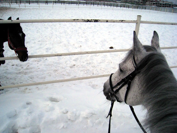 В вестерне же ездят вообще на провисших поводьях! Я пока не начала заниматься, мне казалось, что это ужасно - ездить на безповодной лошади! А когда начала - поняла, что контакт очень даже есть! Мы с Белкой ездим примерно так