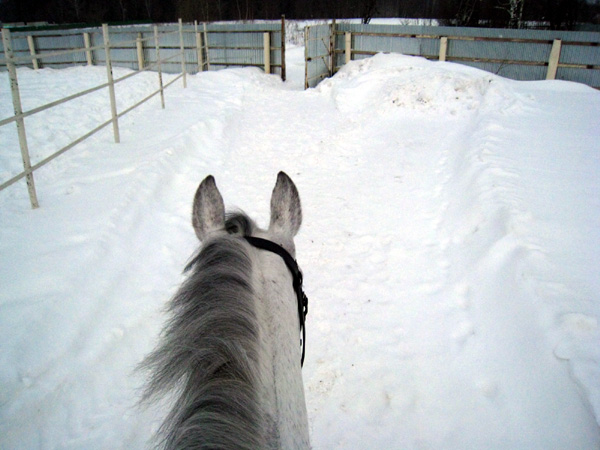 но при этом я очень чувствую, что лошадь у меня "в руках", и даже небольшое мое шевеление поводом она не только чувствует, но и отвечает на него! У меня есть видео одного очень успешного тренера по вестерну, он там проводит такой тест: дает человеку в руки трензель, человек держит его двумя руками за спиной, чтобы не видеть. А тренер при этом тихооонечко шевелит сильно провисающими поводьями, а человек должен угадать, каким поводом - правым или левым. И человек всегда "угадывает", точнее, чувствует! Хотя тренер ни разу не натягивает поводья! А ведь у лошади рот намного чувствительнее наших рук! Так что мое ИМХО, подтвержденное практикой - вполне может быть контакт без натянутого повода! (хотя, наверное многие скажут, что нельзя сравнивать выездку с вестерном, но... если лошадь чувствует и отвечает воздействию повода - это и есть контакт?)
