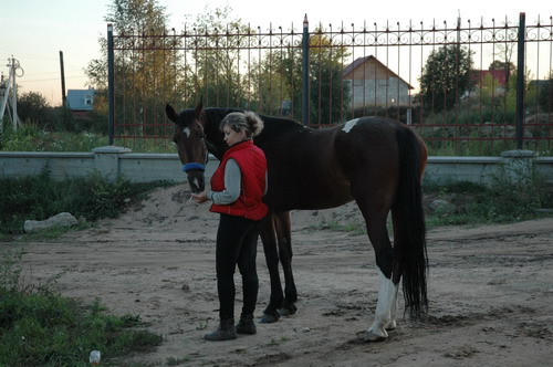 В субботу наоборот лошадь еле ползла. В начале пока мы ещё шагали при нас пробивали на прыжки другую лошадь. Кобыла пучила глаза и вздрагивала на каждый удар хлыста, словно он был по ней :shock: Оглаживала её, угощала вкусным.....Но помогало мало. На рыси она еле ползала, на шагу тоже еле перставляла ноги. Вторую рысь вообще пришлось держать на пинковой тяге :shock: Пришлось её сократить. На галопе кобыла шла довольно сокращенно и ровно, опять же при некоторой поддержке пинковой тягой :shock: И даже отшагивалась потом очень медленно.....