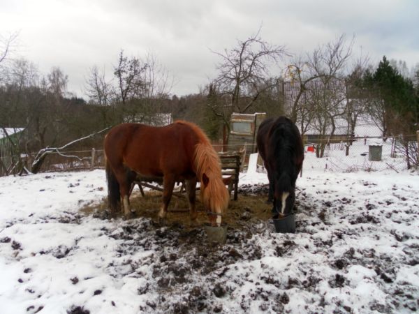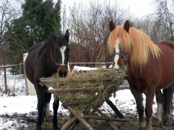 Да кормлю обычно: сено, мука ячменная, когда есть кормовая свекла - даю свеклу, иногда тыквы ломоть, капусту или яблоки, одним словом что есть. Витамины даю зимой, соль с минералами покупаю. Сейчас обе в запуске, надо вету позвонить что бы проглистогонить, за одно и лошадей.