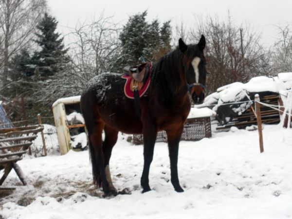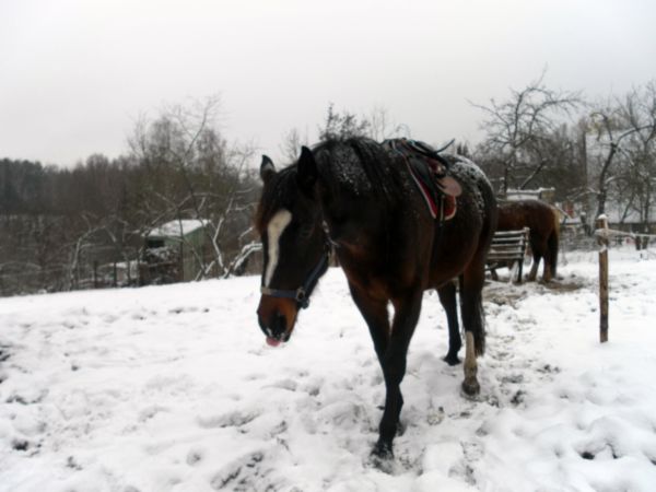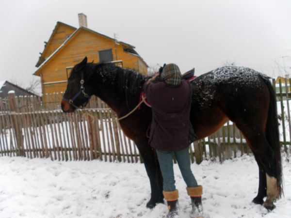 Манька во время обеденного кормления сено есть не хотела, а ходила за мной хвостом, зная что у меня в кармане есть сухарь. Я достала седло ,что называется : Манька сама виновата - напросилась и давай ей на спину кидать. Пол года прошло с нашего последнего занятия, но седло она восприняла спокойно. Пробовала затянуть подпругу, но кузькина подпруга Марьяне коротка, идти за длинной я поленилась :oops: , поэтому просто просунула конец подпруги в путлище, имитируя, что затягиваю подпругу и решила, что на сегодня хватит . Теперь надо начинать понемногу заниматься, если конечно снег не стает.