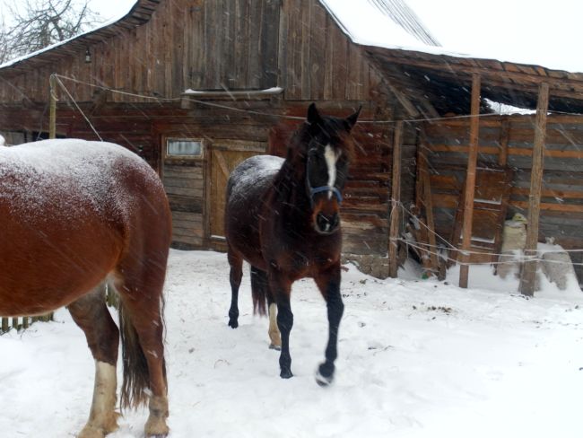 За время нашего отсутствия наступила зима, грязь в леваде замерзла колдобинами и бедные лошади почти лишились возможности передвигаться. :( Сегодня наконец то пошел снег, хочется что бы его было побольше и наконец уже установился грунт. Жаль саней нет, так было бы хорошо Кузьку запрячь.