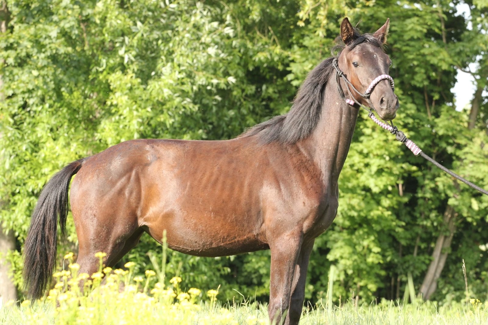 Оповожена, дает все ножки. Любые манипуляции переносит без проблем. Очень смышленая кобылка, тянется к человеку. Перспективна в спорт.