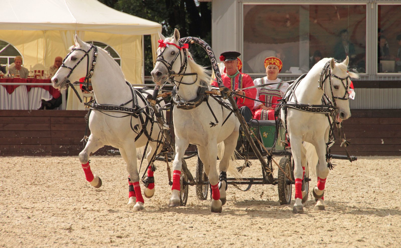 В призовой езде совершенно неважно, с какой ноги идут пристяжные. Иногда вообще они скачут нога в ногу. И шею никто не гнёт. На фото Вологодская тройка, наездник А. Чистяков. Победный финиш.