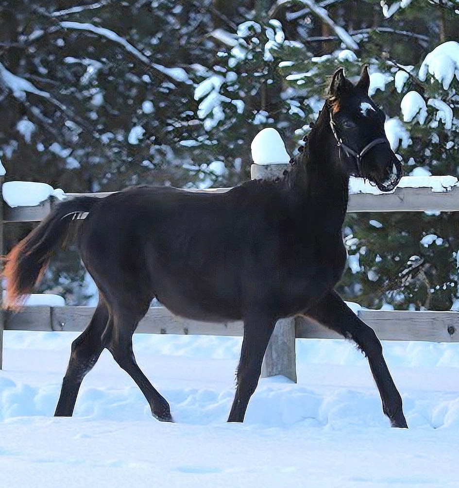 Оповожен, приучен ко всем бытовым манипуляциям. Обладает тремя правильными, ритмичными и амплитудными аллюрами, сильным толчковым задом. Активный, любознательный, тянется к людям. Весь световой день на выгуле в компании сверстников, получает корма премиального качества. Есть возможность оставить на базе для доращивания и последующей заездки по желанию.