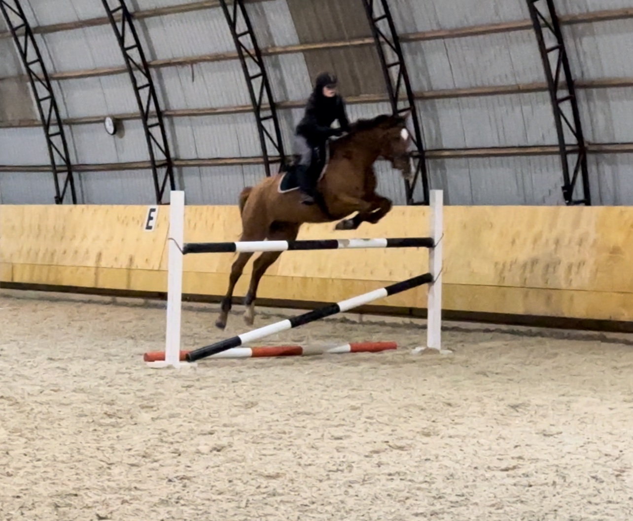 Прыгает дома маршруты до 110, упражнения/одиночки до 130, страшилки, любые комбинации без проблем. Перспектива выше, нет всадника. Делает менки, уступки, плечи, принимания, после прыжка легко возвращается в контакт.