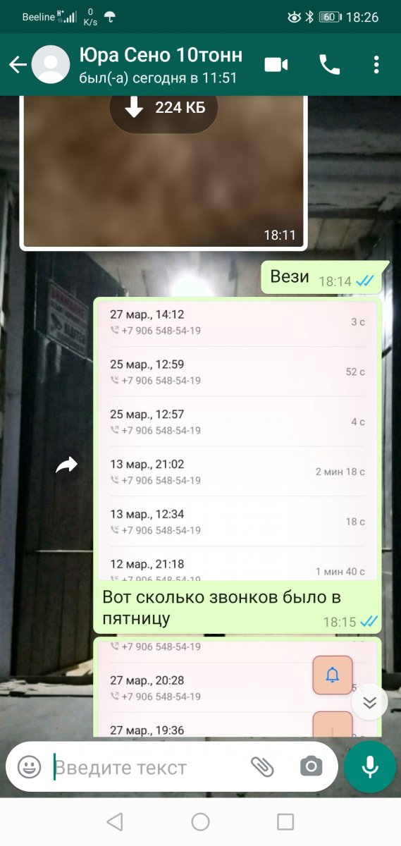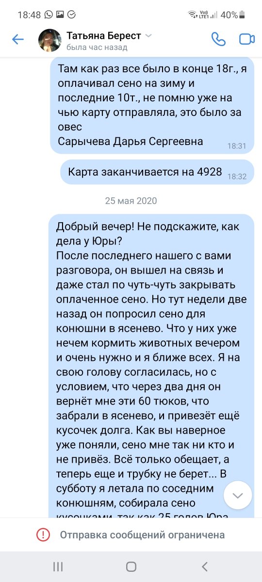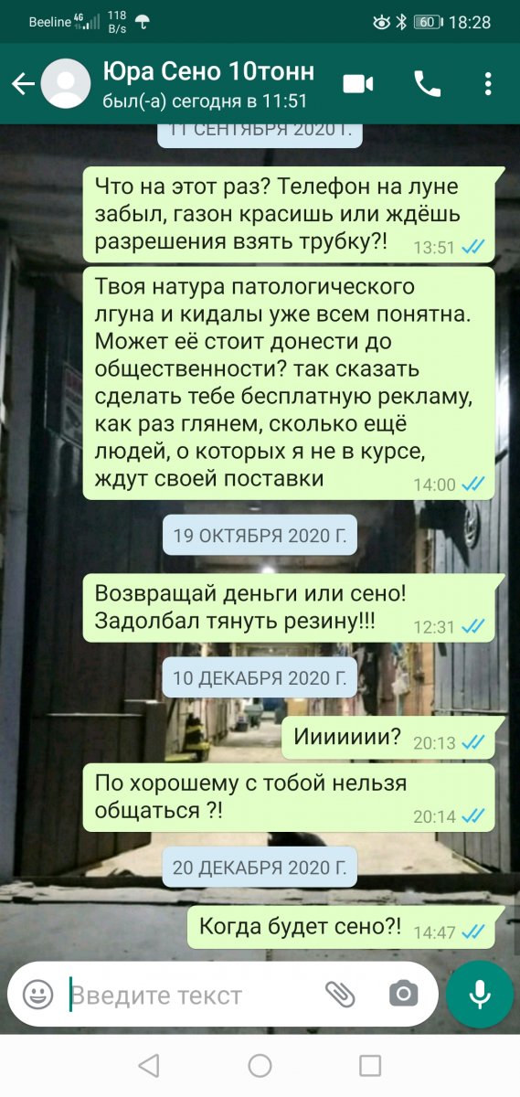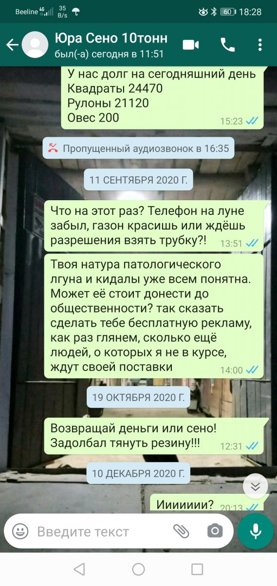 В течение нескольких месяцев. До этого год работали и все было отлично. И сено хорошее, и доставка секунда в секунду, и вес реальный. Получается пока я ему переводила нужную сумму за необходимый объем сена на зиму, он успел привезти мне сена на 100тыс, а потом начались завтраки.