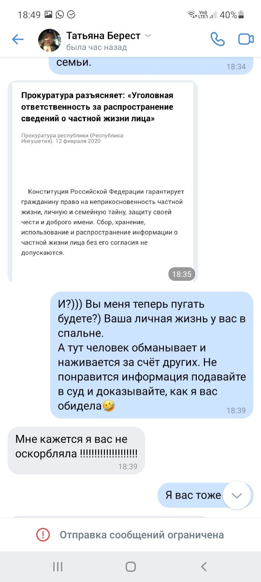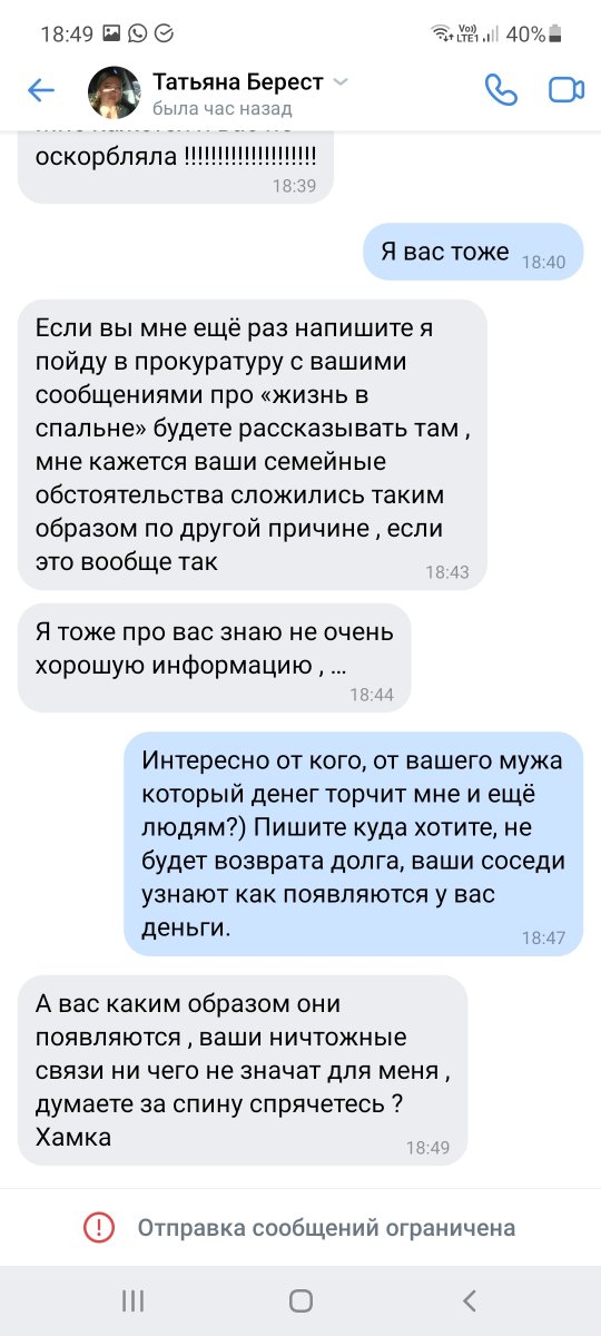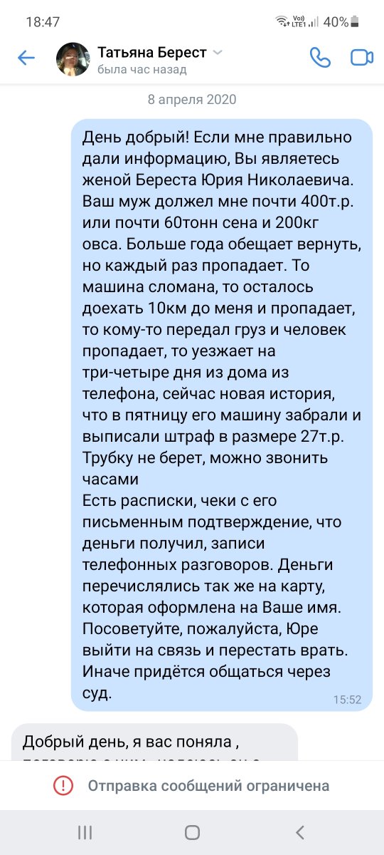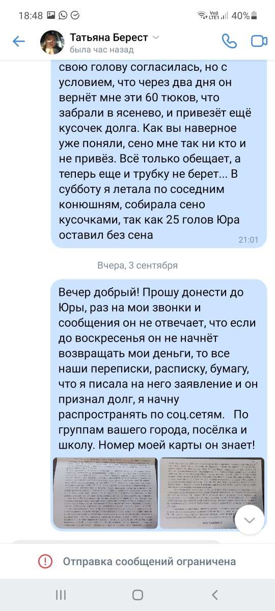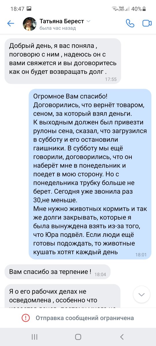 На данный момент человек опять не отвечает на звонки и сообщения. Хотя в августе обещал начать закрывать долг.