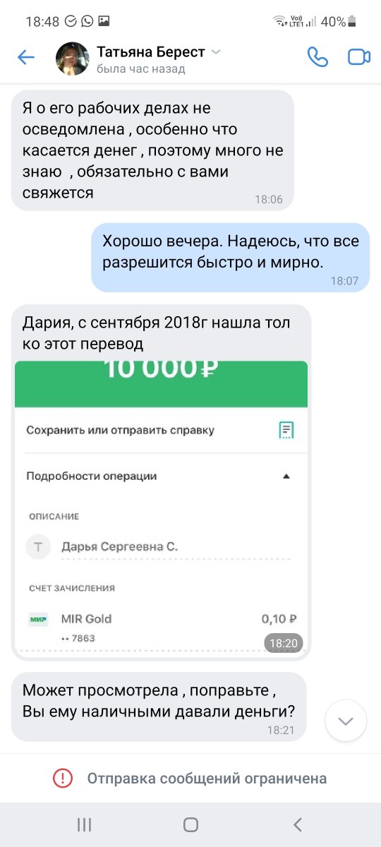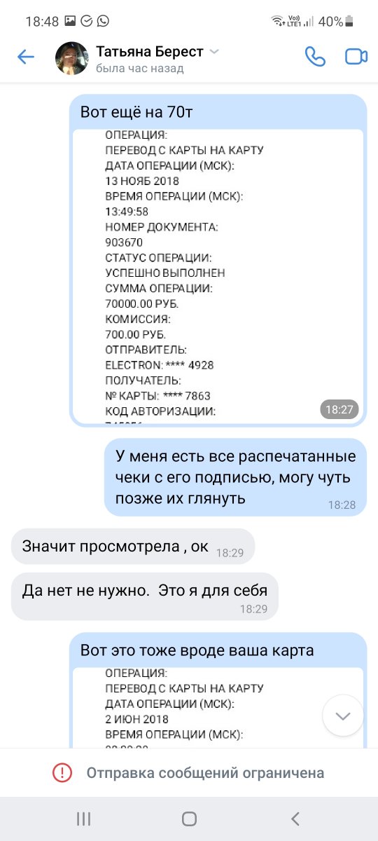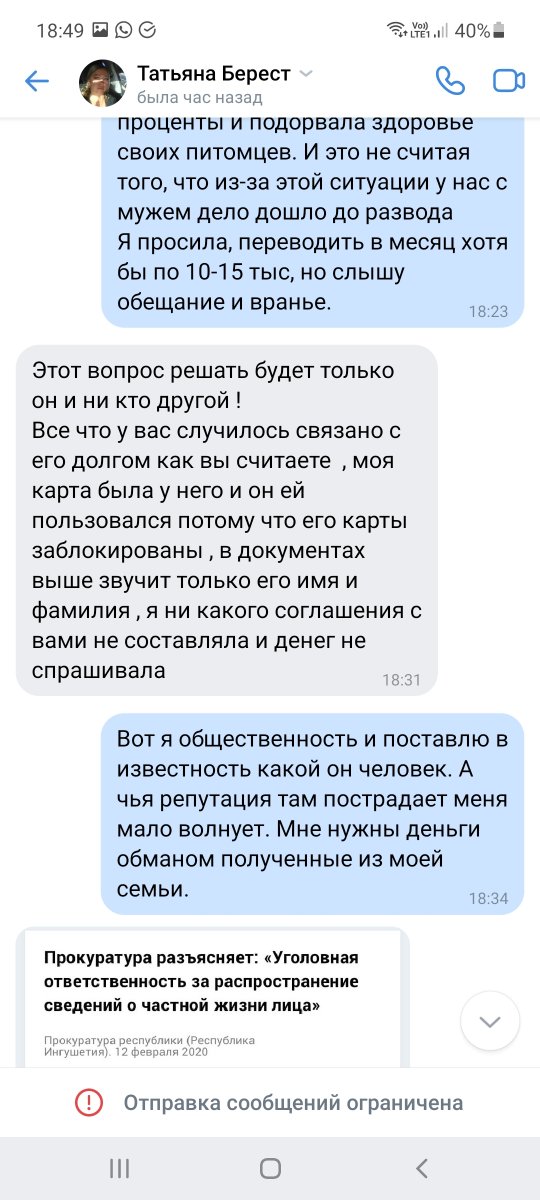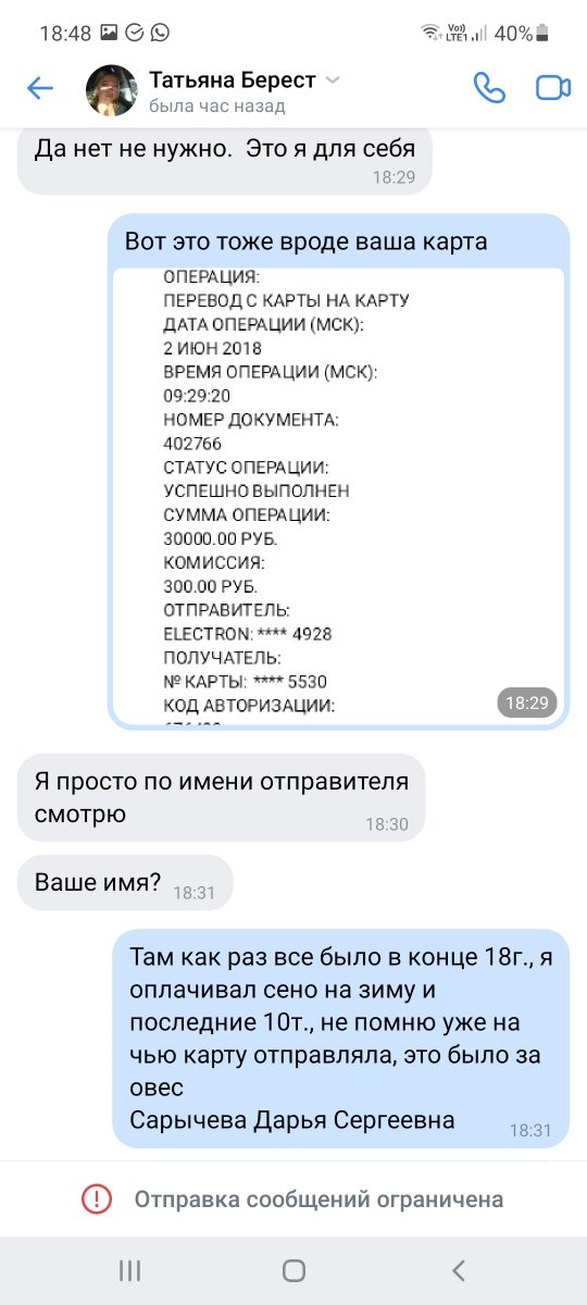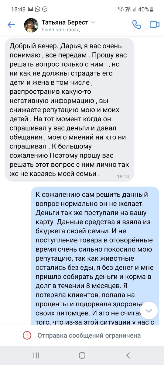 И переписка с его женой, на карту которой так же поступали деньги за корма. Деньги должны они, а хамка я. Вот так у них все просто.