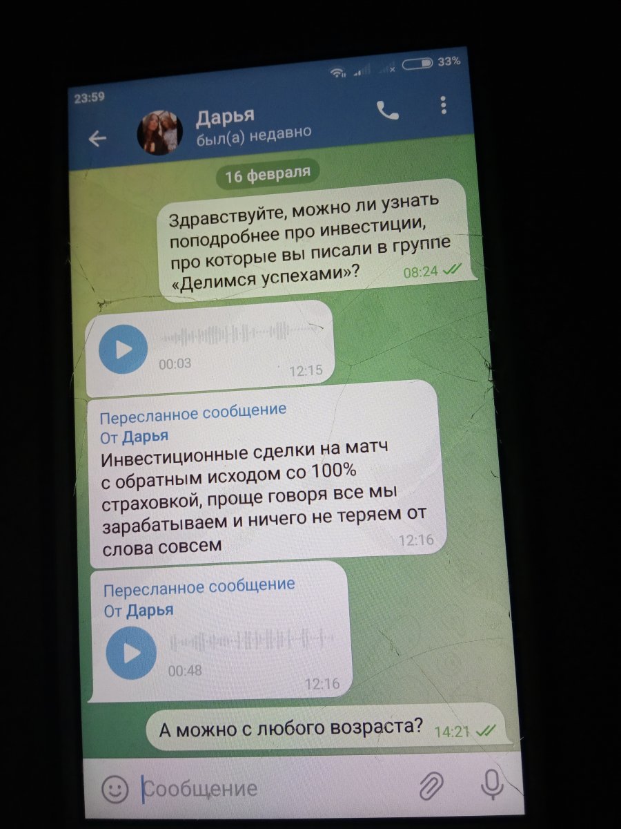 Ситуация: недавно дочь (подросток 15 лет) - мозгов, как выяснилось, нет, и что печально, не знаю, как их ей прикрутить.. так вот, стала выпрашивать карманные деньги. Непременно 1000р. Ну ок, надо так надо, выдала. Вскоре выясняю, что деньги пропали. Даже 2000, видимо, ещё скопила. Куда делись? В "инвестиции"! Ставки на спорт без проигрыша. По приглашению мошенников в телеге деть зарегалась на какой-то платформе, внесла 2000, вскоре платформа закрылась. Что удивительно - мошенники, зазывавшие на платформу со скринами своих "доходов" - внес 30к, вывел 80.. продолжают спокойно сидеть в тг. Якобы они тоже пострадали, ага. Ребенок уверен, что это правда? не понимает, что зазывали изначально мошенники..