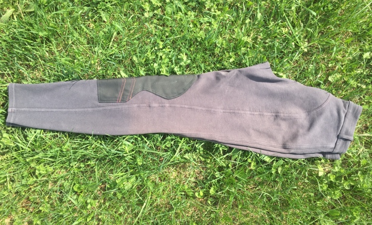 Серые, немного выцвели, кожаные вставки на коленях.