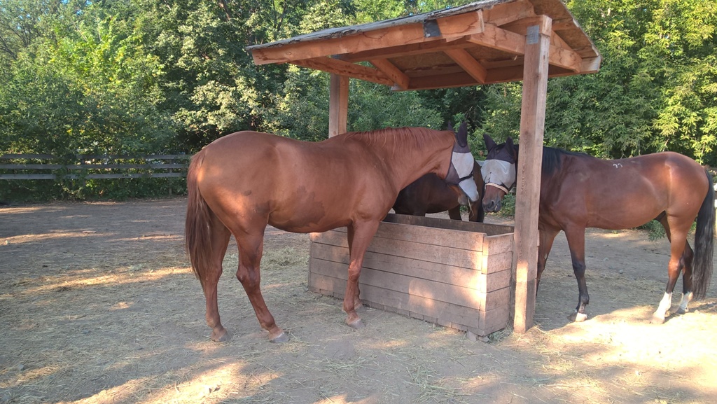 очень удобная штука - стационарные кормушки. Деревянный ящик под навесом, в который на сено кладется металлическая решетка. Ничего не просыпается и не мокнет, то, что не проели (кусты там закосили в тюк или полынь), выгребается и утилизируется. Расход сена уменьшается очень существенно. Когда таких кормушек несколько, лошади постоянно ходят от одной к другой - видимо, ищут лучшей доли:D