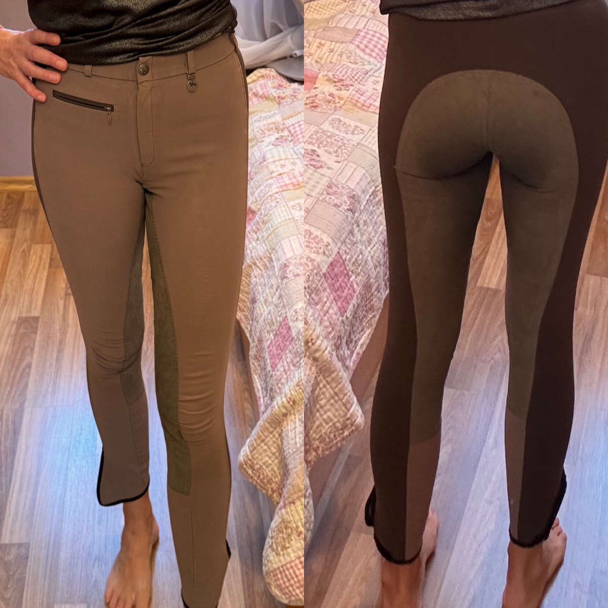 Бриджи кофейные Pikeur , с полной Леей, в районе колена разошелся шов , не критично растянуто , см фото на мне( мой рост 176) , сидят отлично , внизу липучки