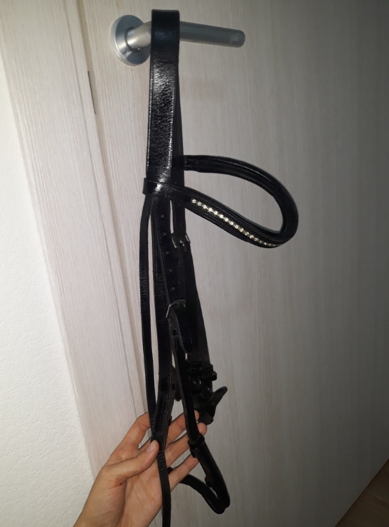 Оголовье в хорошем соотоянии. Всё целое, стразы на налобнике все на месте. Оголовье сделано из натуральной кожи. Прослужит вам ещё долгое время.