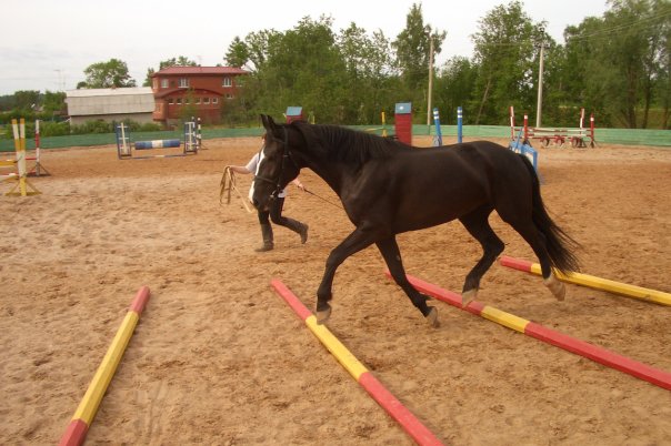 ..Тем временем, продолжаем развлекаться с Васяшем). Уже гораздо лучше понимаем друг друга. Перед чисткой обязательный ритуал)). Пообниматься-поцеловаться))). На улицу выходим,как обычно, не очень охотно. Но разминаться ездим теперь на рель. Коню там явно больше нравится,чем на плацу. Туда энергичной рысью, обратно- спокойным галопом. Тащусь от коня)). Бежит спокойно, не рвет никуда. При встрече с другими конями, грустно провожает их взглядом , но четко выполняет мои команды)). Чудо-конь!)). Рысь рабочая у нас получше стала, на галопе, только вот паразит, еще ложится в поворотах на руку. Но уже легче.И это радует)).. Пробовали недавно прыгать.Прыгает с охотой и импульсом. Маленькие препятствия не замечает, бежит рысью. Хозяйка сказала,что его ставили на рысь через высокие кавалетти..Теперь вот не воспринимает их ,как препятствие..Ну да ничего, будем прыгать повыше)))).