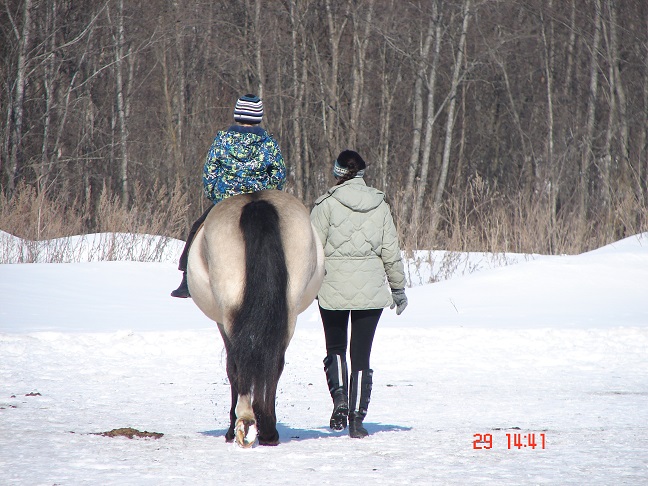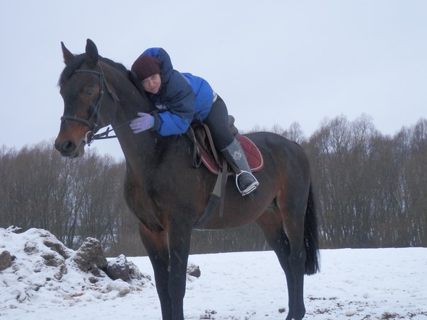 Вчера тетя тренер подарила праздник! :D Отправила в поля на любимой лошади-Тине)) .Это было волшебно.Сижу сверху ,как куль,дышу через раз ,на улице темно..Ехали на ощупь)) Лошадь просто умница,нет,УМНИЦА! Везла меня ,ну почти,как хрустальную вазу)) Я ожидала чего угодно.И попыток растащить,и шараханий в стороны. И..НИЧЕГО!))) На все мои просьбы-быстрый отклик и практически полное послушание.Один раз только ветер под хвост дунул)) ..Я в восторге от кобылы!!!))) Заезжена менее года назад,а вела себя ,как опытная дама)..Еще б дышалось получше и вообще -жизнь удалась))