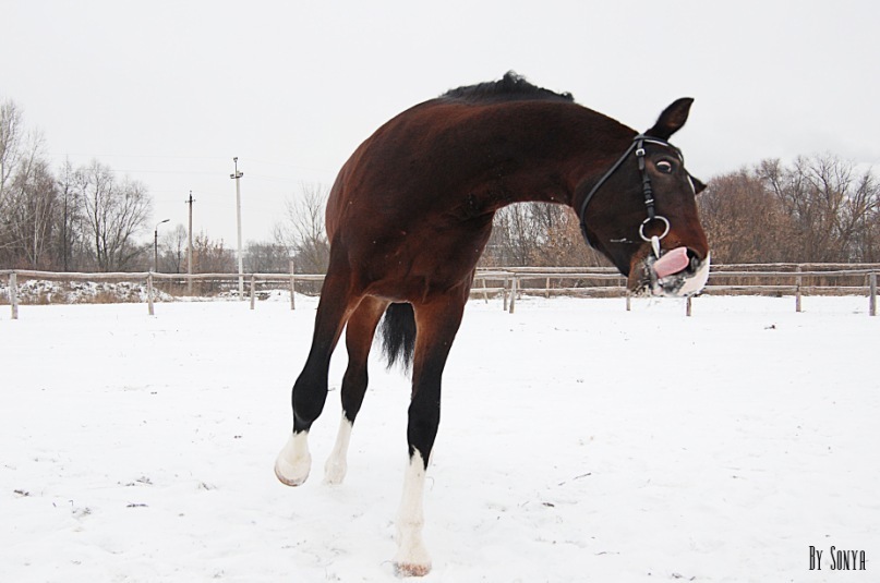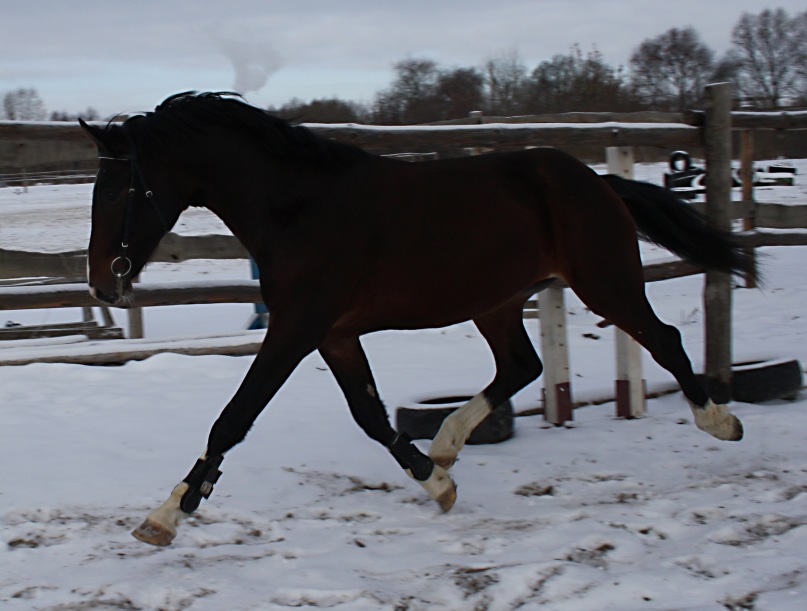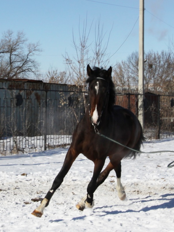 И вот декабрь.Всё замёрзло,выпал снег.Шагаем по конюшне…печально..весь декабрь шагали,один раз бегали на корде.В январе было не так скользко и мёрзло.Бегал в левадах,опять же бездельничал))