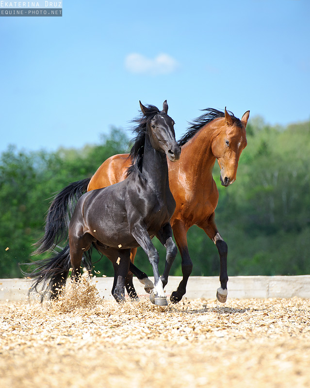 horz001, не будьте столь категоричны. Я своими глазами видела кроющего жеребца породы квотер, который гулял в одной леваде с разными меринами, и ему было глубоко плевать, провели мимо кобылу, или мерина, и вообще что там вокруг левады происходит. Ну вот такой он был, не задирался не к кому, тихо себя вел. Мой может по молодости (летом 4 года будет) ко всем лезет дружить и общаться, и вполне может гулять в одной леваде с мерином. Но это не каждый день ему так везет, потому что совместные прогулки зависят от того, насколько мерин загружен работой. А около года назад он будучи трехлеткой был выпущен на фотосесию с двухлетним жеребчиком на плац (оба с яйцами), и все живы здоровы. И для сравнения, знаю жеребцов которые воспринимают сородичей только в двух вариантах, либо надо крыть, либо бить. Разные бывают. А вот вам фото в доказательство того, как могут общаться жеребцы. Агрессии по отношению друг к другу нет ни на грамм.horz001 написал(а):Жеребец может вести себя адекватно если он один)а если жеребцов много и табун кобыл ,то тут уже ничего не поделаеш приходится изолировать...