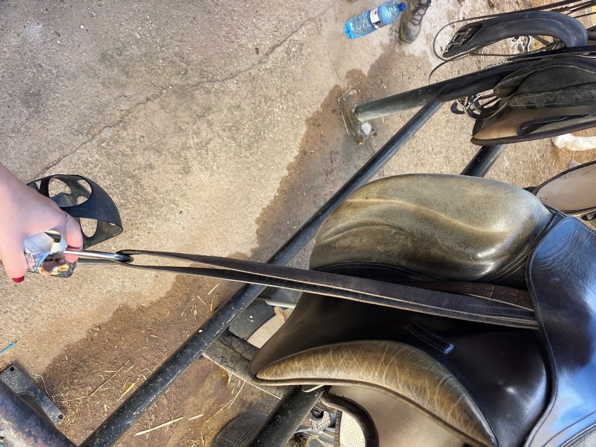 Беру кобылу за повод и пару минут шагаем в руках без стремян правильно положив ногу.