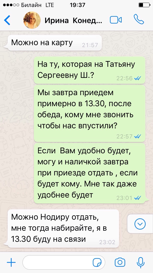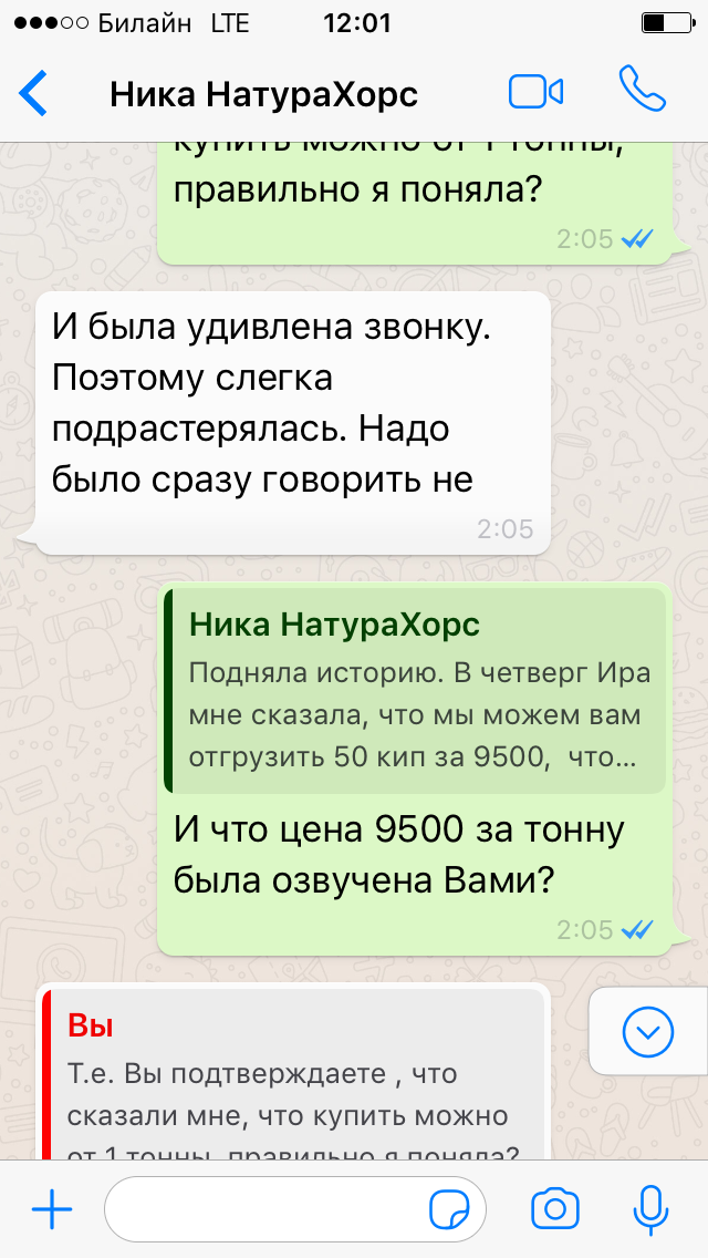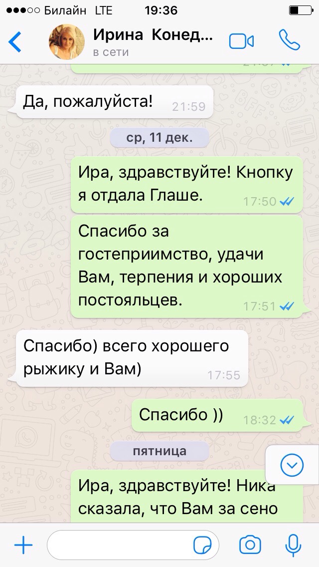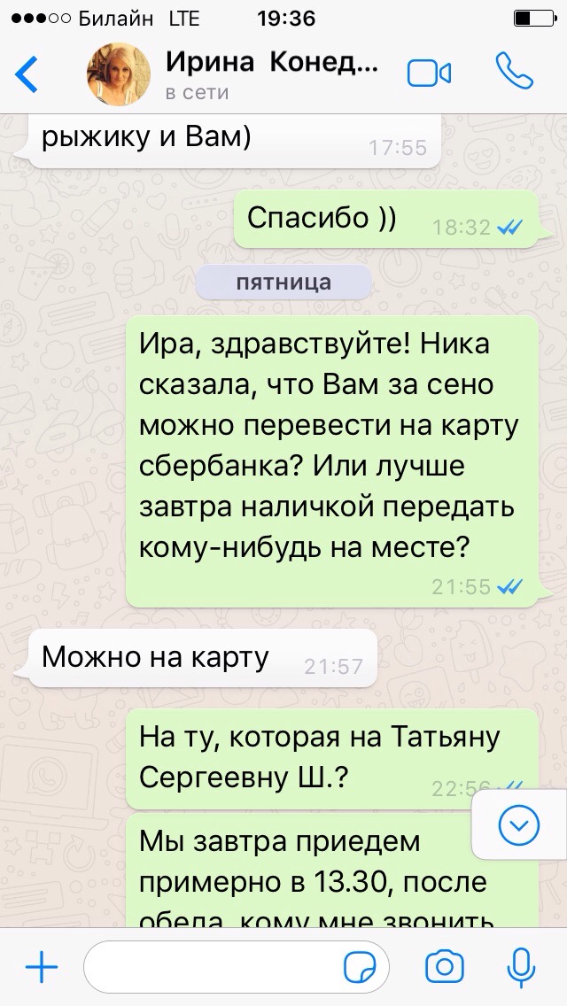 На самом деле же сначала на следующий день(в пятницу) я перезвонила Нике и спросила все ли в силе и как лучше оплатить сено, во сколько можно приехать и нужен ли свой работник для погрузки. Ника ответила, что работник нужен, приезжать не раньше 11, чтобы конюха были не заняты, оплатить можно Ирине на сбербанк. И только после этого я решила на всякий случай уточнить у Иры, удобно ли будет получить оплату ей на сбербанк (скрины с перепиской с Ириной и со временем звонков в тот день и перепиской прилагаю, по ним видно что до этого мы с Ириной общались в последний раз 11 декабря). После сообщения Ире я стала договариваться с водителем коневоза и оказалось что выехать мы сможем не раньше 13. Еще раз уточнила у Ирины насчет оплаты (и заодно сказала про изменение во времени) т. к. помню что когда платили за постой, обычно она указывала другой способ оплаты. Договорились в итоге что приедем в 13.30-14.00 и что я отдам наличкой. Вот только тут уже Ириной была брошена фраза 9500 за 50 кип и что 190 рублей за кипу(скрин прилагаю). Но так в этот же день за пять минут до этого мы разговаривали с Никой и она подтвердила, что все в силе и не сообщила, что отгружает не тонну, а 50 кип, я не стала уточнять этот вопрос . Вот это и было моей главной ошибкой во всей этой истории. Всегда нужно уточнять, за что конкретно ты платишь именно у того человека, которому ты отдаешь деньги.