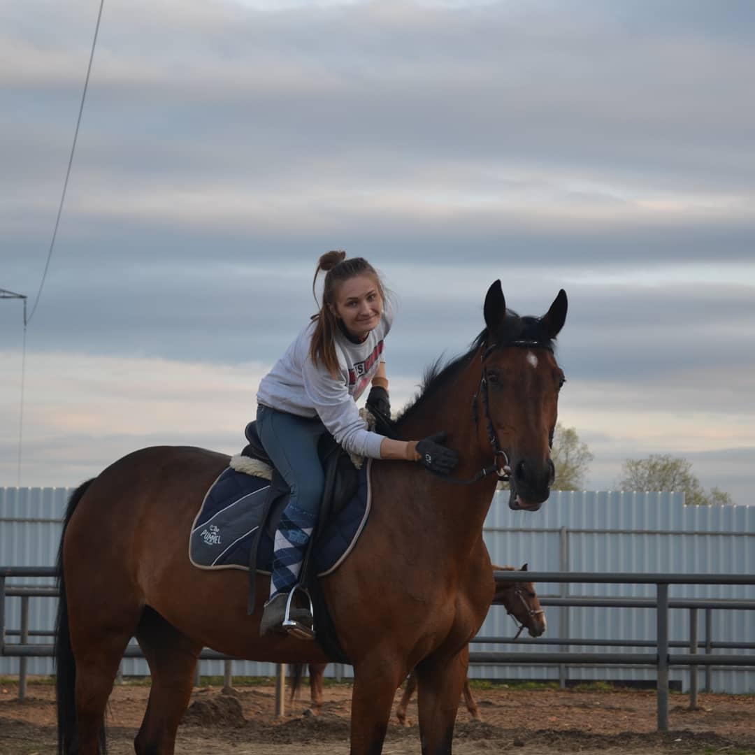 При правильной и грамотной заездке подойдет в любительский конкур и выездку, кобыла нефорсированная. На данный момент изучаем кавалетти (высокие, маленькие на рыси, учимся считать перед барьерами, боковые движения, переходы шаг -остановка-осаживание-шаг-подъем в рысь, шаг-галоп- остановка ), есть видео прыжков 60-90, выше не ставили, сама ведет на барьер.