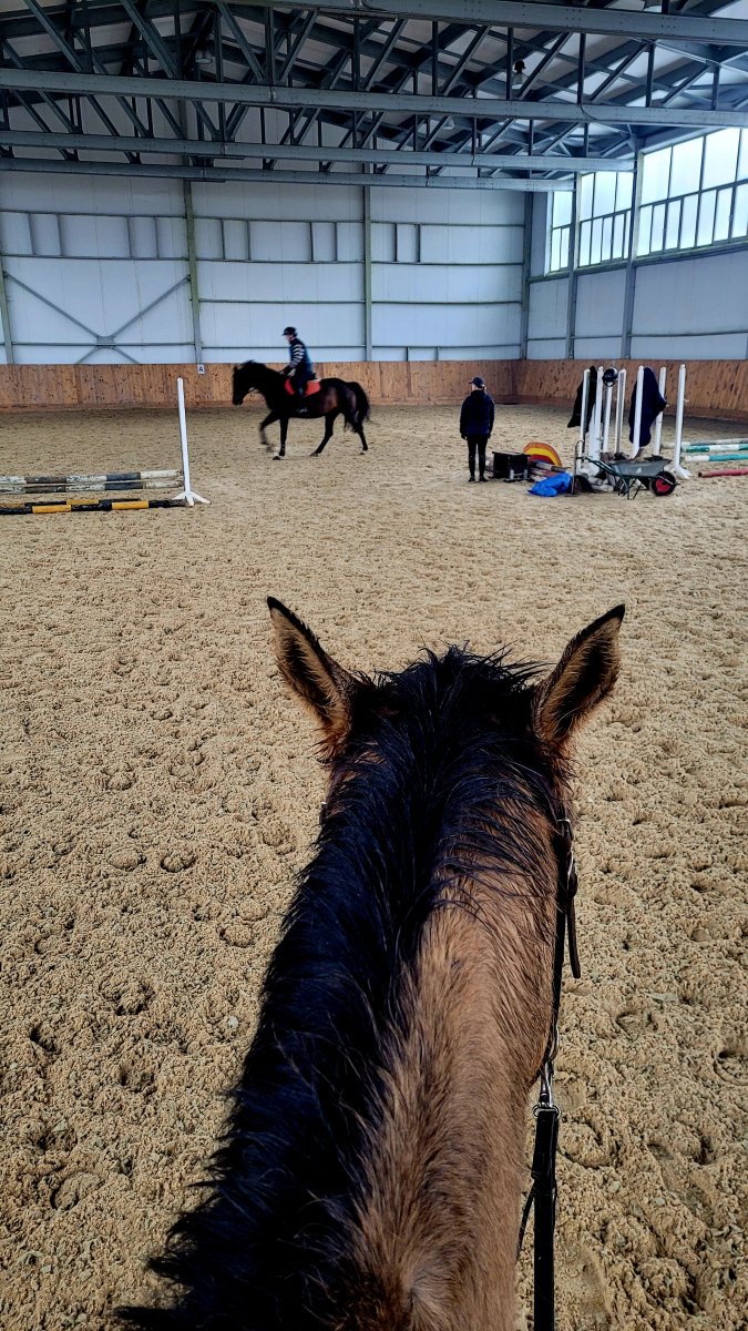Самого места она не боится, бывала там и не раз. Но под верхом нет привычного рядом человека, потому несколько растерялась. Вообще был план и порысить, но посмотрев на это всё решила, что пожалуй не буду нагнетать, просто пошагаем, Масе это было не просто))А как Масе манеж сам по себе? Не испугалась большого закрытого пространства, крашенных палочек и бегающих лошадей?)