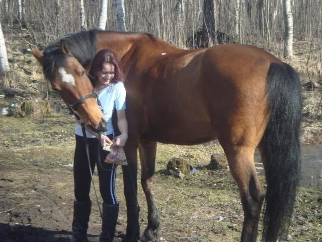 Пока возвращались на конюшню, скормила любимому весь запас сахара. Он же умница, старался! Расседлав, промыла трензель и отнесла всё на свои места. После чего высыпала Орлику всё, что приготовила ему в течении недели (Морковь, сухари и много вкусных яблок). Поцеловав его в тёплый и вкусно пахнущий нос :kiss: , помчалась уже по своим делам!