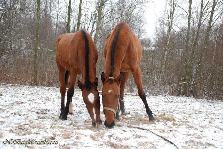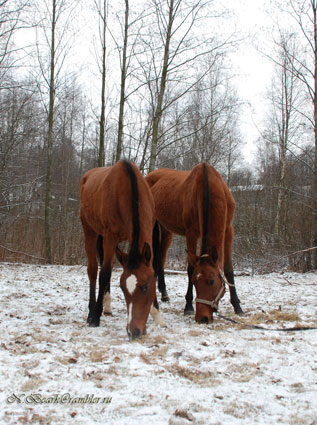 Поскольку в кои-то веки Леша не работал в это воскресенье, мы решили выгуляться на Косу... Хотя по прогнозам везде писали метель, мы на это обстоятельство мало обращали внимание... Рано утром выехали на конюшню, я вывела Гуську в табун, Тусика в шпринт, и мы поехали к морю. В итоге вернулись мы только через 4 часа, поэтому кони довольные и счастливые нагулялись по самое немогу :) Самый прикол, что когда я их выводила, то не переодевалась в конюшенную куртку для ускорения процесса. Так вот Гуся, которая обычно завидев меня из табуна, сразу бежит ко мне, тут она до последнего не хотела верить моим рассказам, что это я, и пока я сама не подошла, так и стояла неподалеку...
