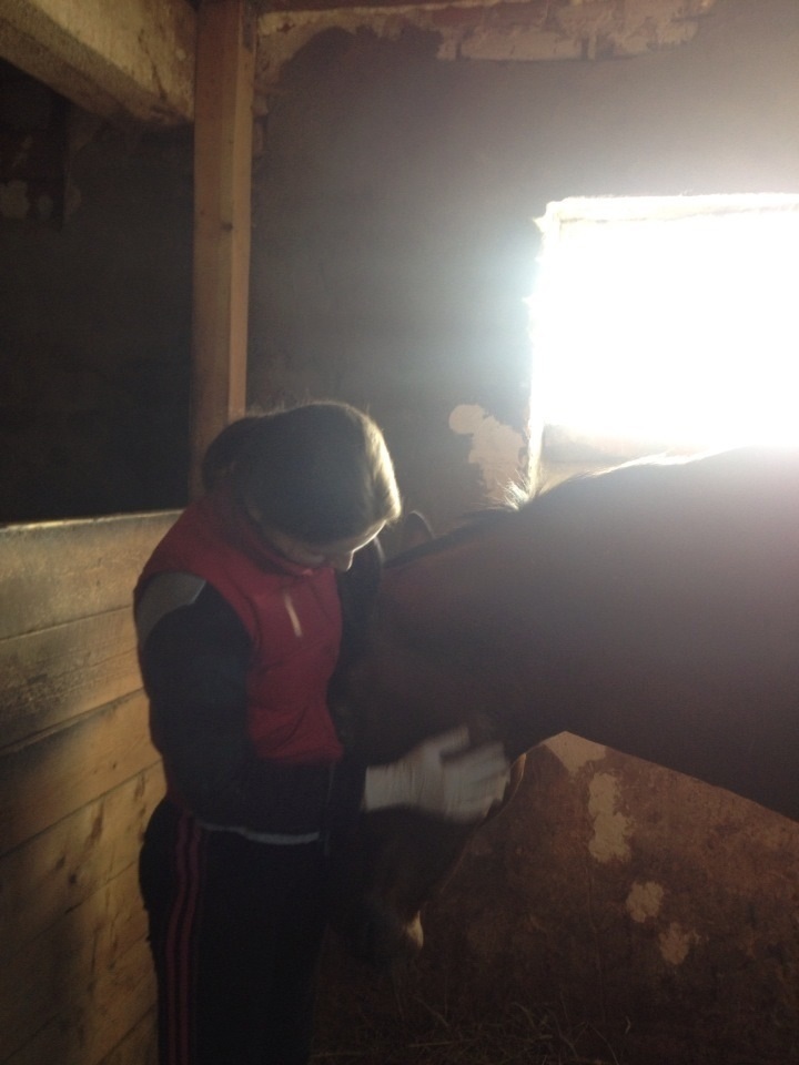 Упала спать, в 5.30 проснулась от стука... Выхожу - стоит. Ну и 40 минут где-то мы там бодрились с конем, я подбила подстилку, напоила его, сена подкинула, обработала болячки, растерла щеткой всего коня, чуть хвост причесала... В 6.15 лег и я уползла обратно в койку.