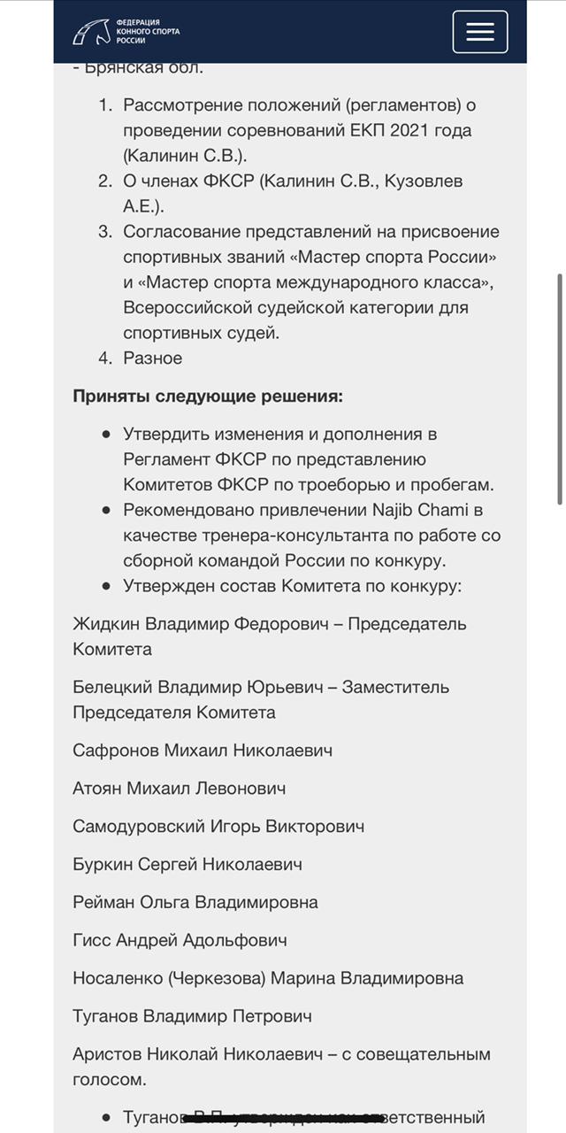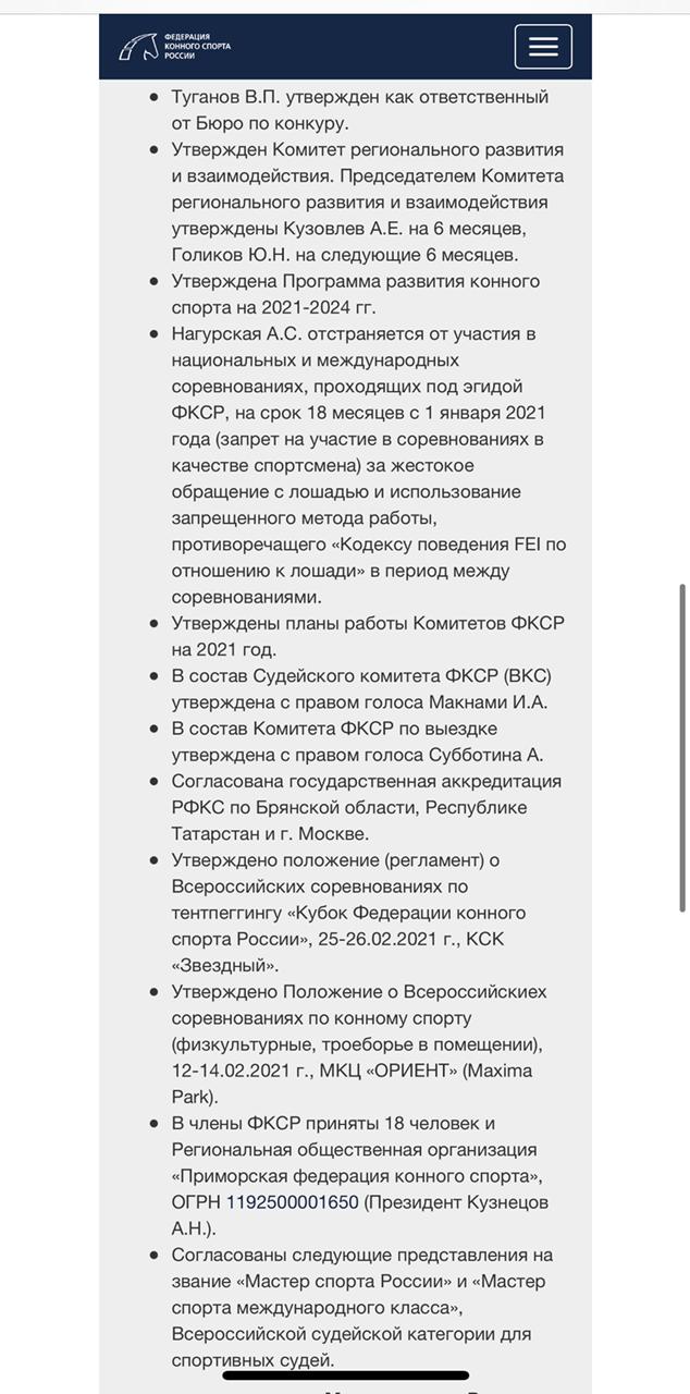 Прошу проверить Решение Бюро Федерации конного спорта России от 22.01.2021 г. на соответствие 35, 43 и 62 статьям зарегистрированного Устава ФКСР в части принятия нового регистрационного взноса на стартующих лошадей в размере 1100 рублей. Данный взнос внесен в Финансовые условия в редакции от 01.02.2021 г. и распространяется на неограниченное число лиц, в т.ч. не являющихся членами ФКСР. Высший орган Конференция ФКСР для утверждения данного взноса не собиралась.