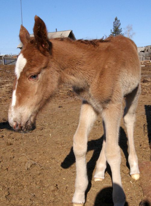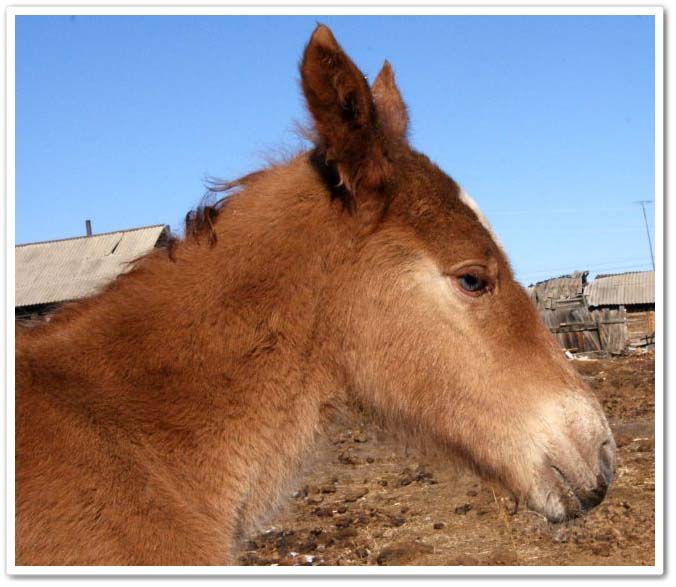 Мать жеребенка - от чубарого забайкальского жеребца и рыжей дочери рыжего буденновца. (Хотя, может быть, я неправильно определила масть кобылы. Ее мать отметин не имела (ну, может, звездочку во лбу)