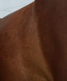 Выглядит гнедой,но на корпусе(спина,бока,попа немного)белые ворсинки,присылаю увеличенный фрагмент-может быть разглядите-реально отдельные волосинки белые на рыжем общем фоне. На шее,голове и ногах их нет-они чисто рыжие с отметинами. Очень интерессно что это=)