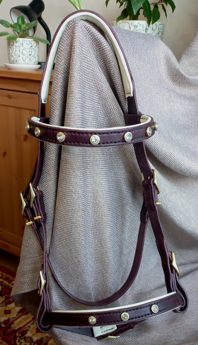 Размер cob или небольшой full. Ручная работа, анатомический затылочный ремень, мягкие подложки на затылочном, налобнике и капсюле. Фурнитура латунная.