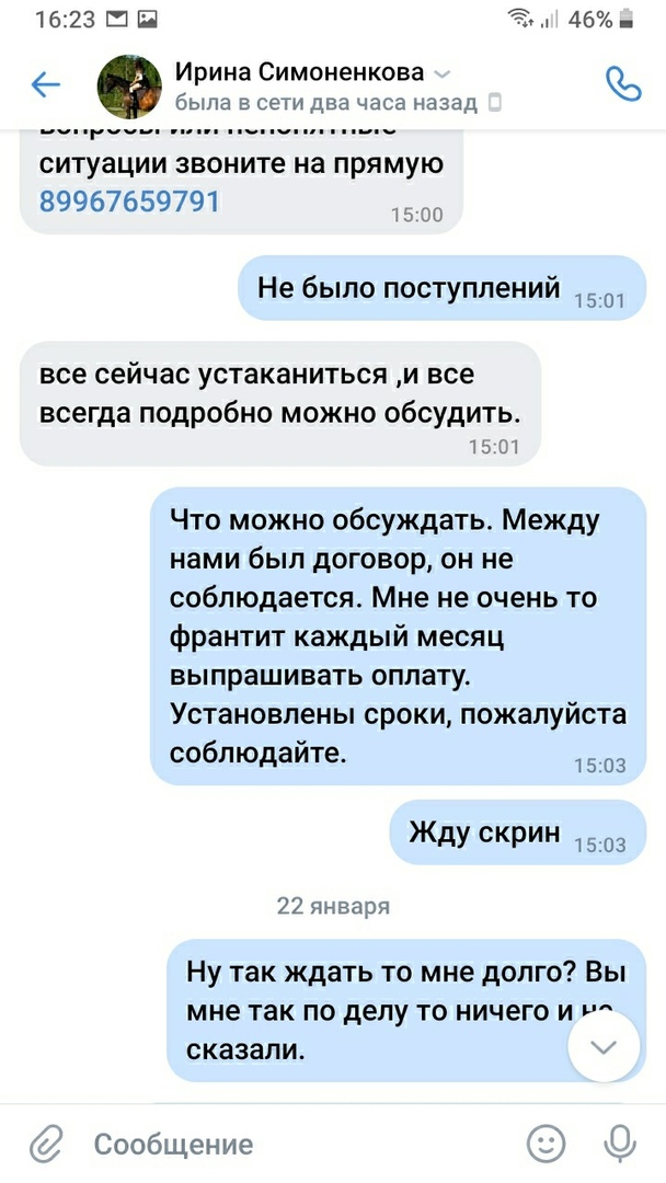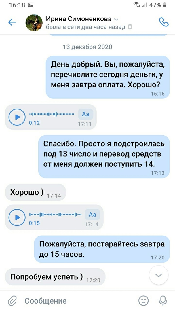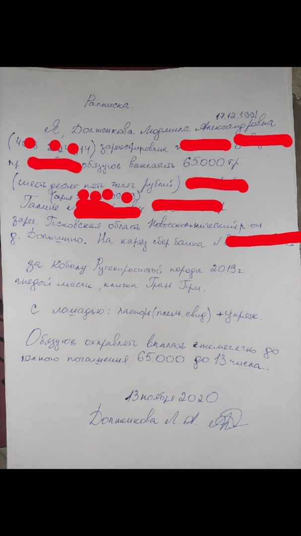 13 ноября между Галиной и Милой была составлена расписка, в которой указано, что стоимость кобылы 65тыс.р. ежемесячно Мила должна была выплачивать от 10 до 15 тыс. Так же до полной выплаты всей суммы, кобыла является собственностью Галины.