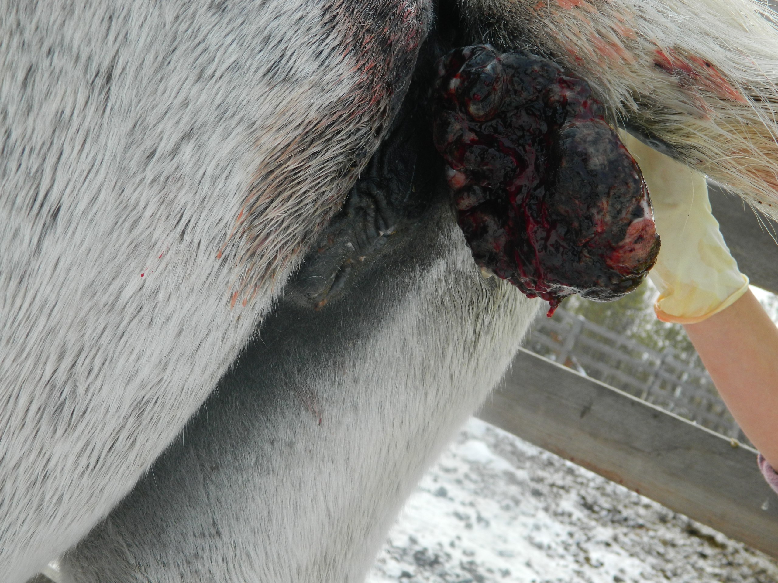 Из рассказов хозяев, летом кобылу начала беспокоить эта опухоль (когда её заметили, она была размером с куриное яйцо) и она её разодрала об забор. Было обильное кровотечение, инструктора останавливали кровь. Но как я поняла, всё это делалось грязными руками и перчатками.