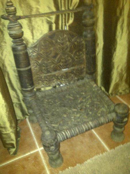И такой маленький стульчик, он сам деревянный, а сидение из толстой плетёной кожи: