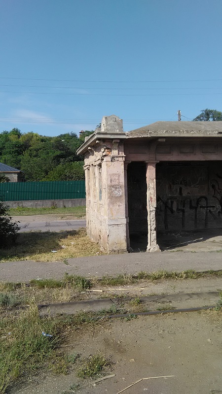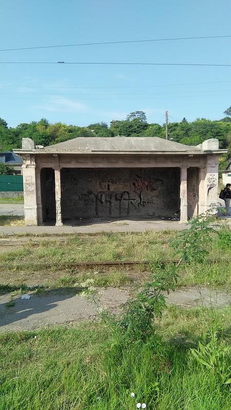 Сохранившийся павильон остановки на конечной станции (как-то на экскурсии об истории Одесского трамвая нам рассказывали, что сначала там не только скамейки внутри были, но и зеркала на боковых стенках, чтобы можно было видеть - идёт ли трамвай? , не выходя на дождь: