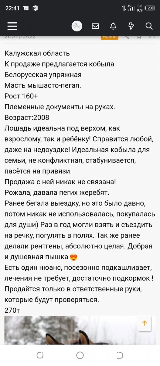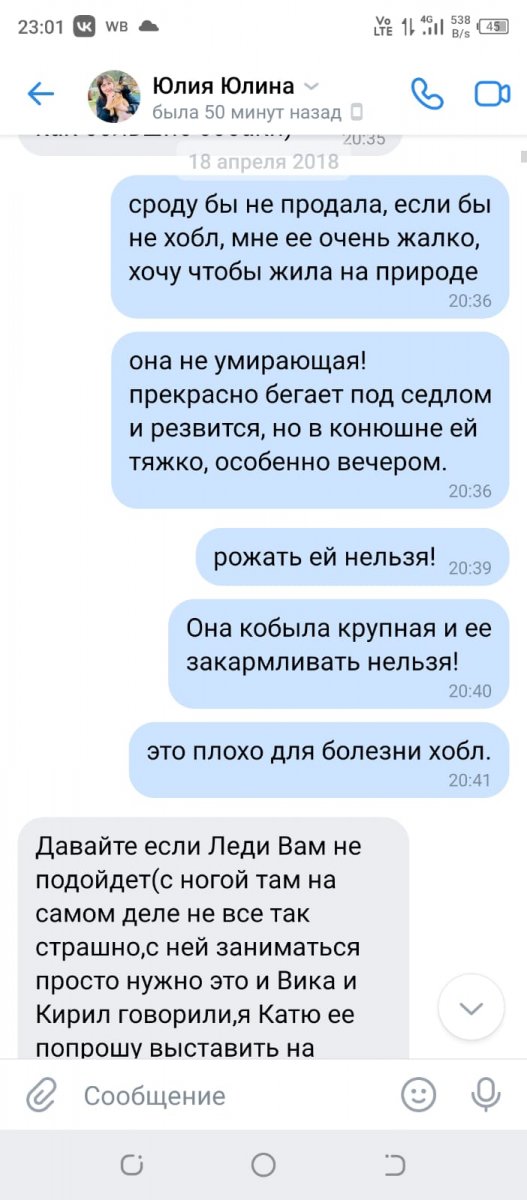 Данная лошадь (Весна, Веста) была продана за 60 т. р как газонокосилка, а теперь продается как здоровая, НО БОЛЬНА ХОБЛ (обследована В. Аликперовой, тогда и был поставлен диагноз)! Жеребиться и нести серьезные верховые не может!